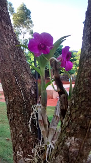 Paro e as contemplo. Lembro das minhas orquídeas e me dirijo até elas. Então meu olhar é chamado a ver a algazarra dos pássaros por toda a grama e pelas árvores por perto. Vejo que deveria trazer para debaixo da garagem e pendurar num dos caibros uma outra casinha menor com canjiquinha para os canários. Minha ajudante voluntária percebe minha dificuldade e embaraço e logo traz uma cadeira para fazer aquele serviço por mim. Desce e volta correndo para sua panela.