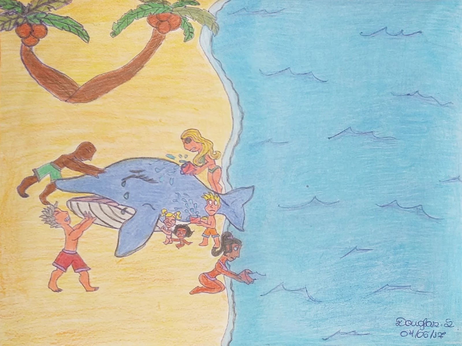 Na manhã seguinte os pescadores da região acordaram bem mais cedo pois os gritos de dor de toda a família jubarte chegava bem distante. Correram até a praia e viram Juju chorando com seu corpo quase todo fora das águas do mar. Foi um Deus nos acuda. A notícia correu logo e, a cada minuto, chegavam mais pescadores e seus familiares para juntar força e empurrar Juju de volta para as profundezas do oceano. Enquanto os homens faziam forças de Hércules as mulheres e as crianças jogavam água por todo seu corpo que já estava ficando ressecado e desidratado.